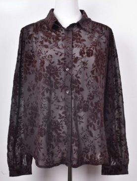 Blus från J/S Millenium Vacker spetsblus med bladmotiv i velourtryck Kaffebrun Genombruten skjortblus med krage och knappar hela vägen framtill 100% Polyester Rekommenderad tvätt: 30 grader