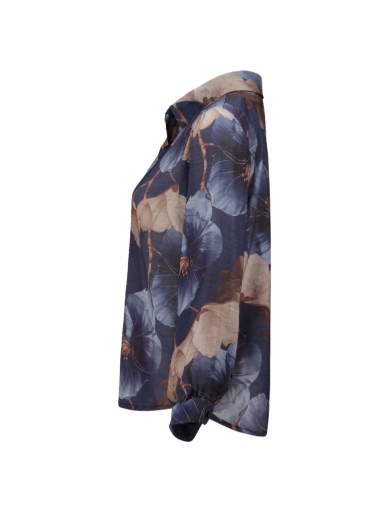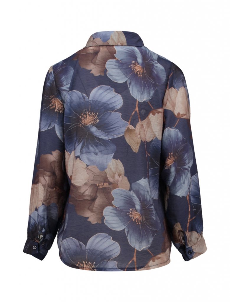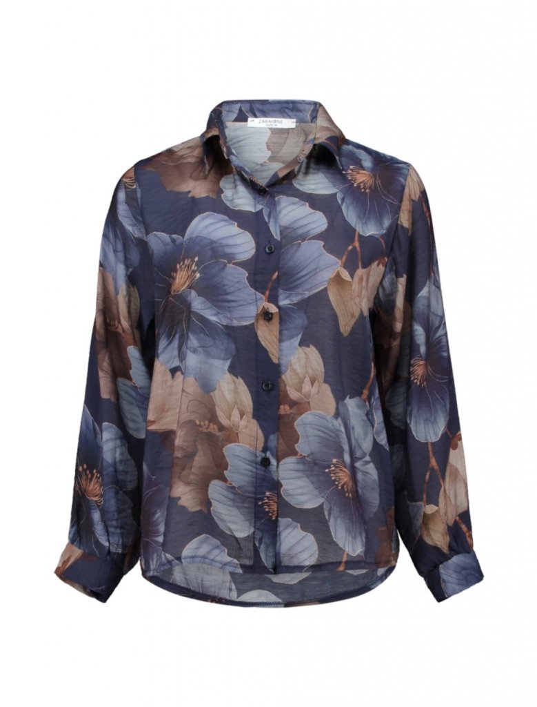 Blus från Zabaione Vacker chiffongblus i blå/bruna toner och blomstermönster Skjortblusmodell med krage och knappar hela vägen Något små i storleken. Vi rekommenderar 1 storlek större än vanligt 85% Viskos 15% Nylon Rekommenderad tvätt: 30 grader
