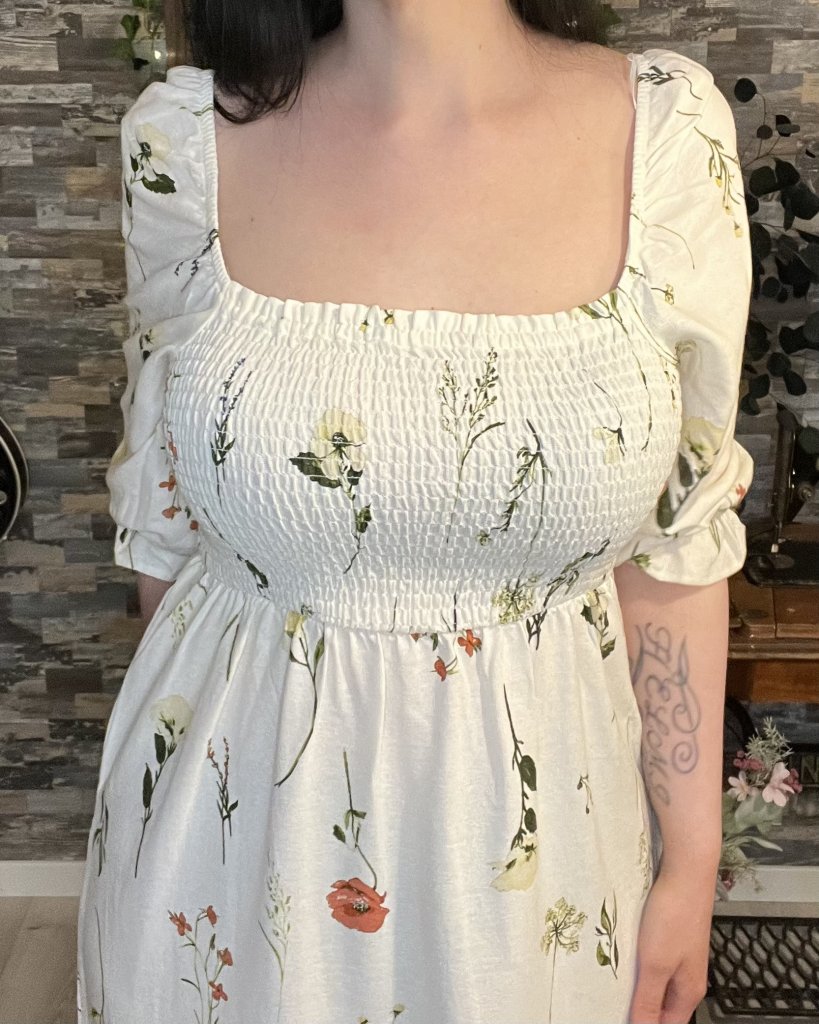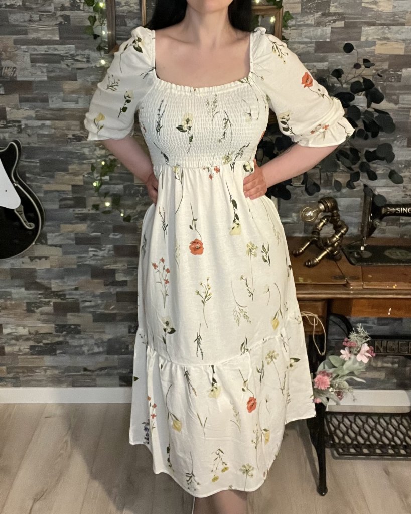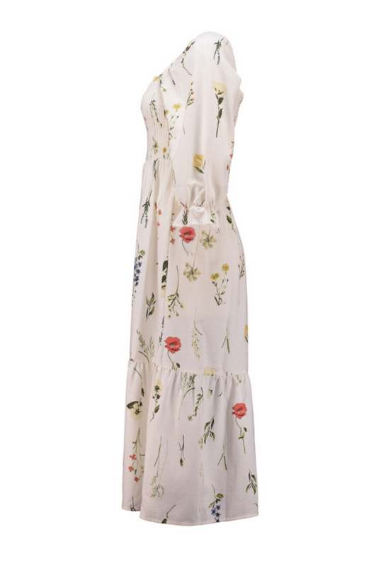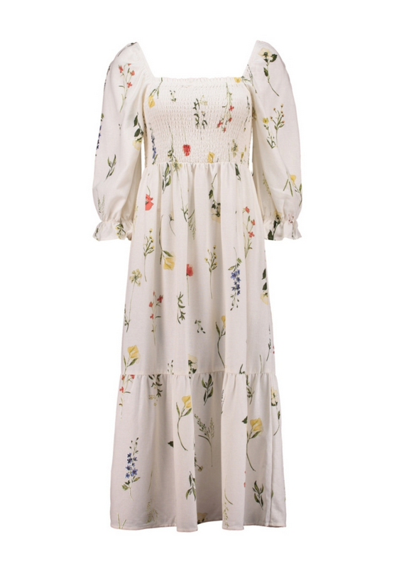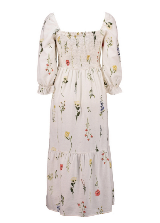 Klänning från Zabaione Söt och somrig volangklänning i cremevit med blomstermönster Smockresår över bystern 3/4 puffade ärmar med resår 45% Viskos 30% Linne 25% Bomull Rekommenderad tvätt: 30 grader